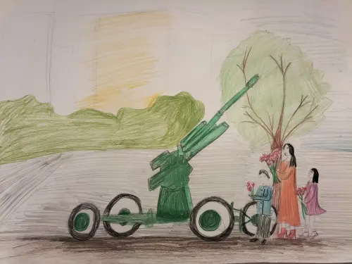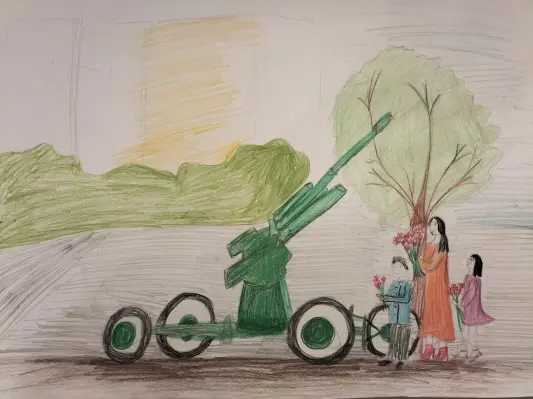 В своем рисунке я показала, что важно рассказывать детям, будущим взрослым отпрлвиге Советского народа. Здорово, что практически в каждом районе Москвы есть своя реликвия, пушка, зенитка, стена почета, то, что напоминает нам о Героях тех лет.