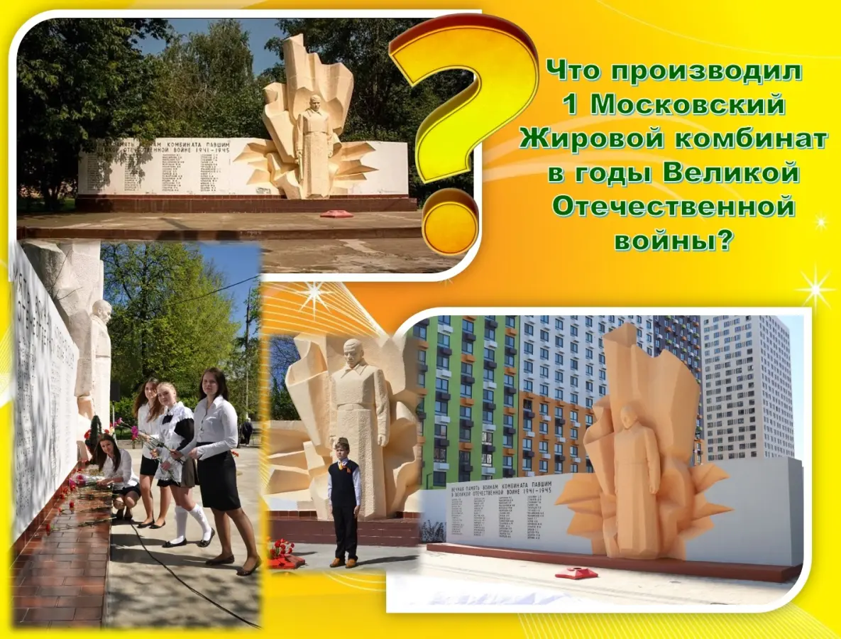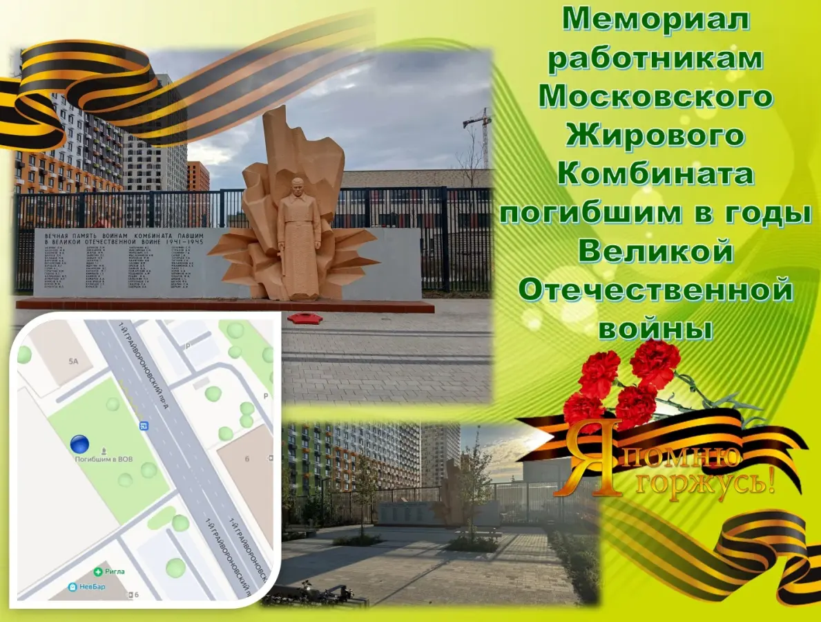 Мы сейчас на 1-ом Грайвороновском проезде, где с 1935 года по 2017 год находился Первый Московский Жировой Комбинат. Московский майонез, маргарин, подсолнечное масло, русская горчица производились именно здесь. И именно отсюда уходили на фронт работники 1 МЖК, чтобы защищать Родину в годы страшной войны. 64 бойца не вернулись. И в их память на средства сотрудников в 1985 году возведен Мемориал работникам Московского Жирового Комбината, погибшим в годы Великой Отечественной войны. Это фигура солдата и плита с высеченными именами погибших сотрудников комбината. В связи со строительством жилого комплекса мемориал в 2023 году перенесён на новое место. Сюда традиционно приходят ученики моей школы № 1367, отдавая дань славы солдатам, которые бескорыстно служили стране, отдавая свои жизни во имя мира и жизни будущих поколений.