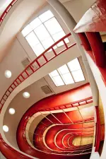Давайте продолжим наш путь и пройдём чуть дальше по Красноказарменной улице до дома 13 и увидим 5. корпус «Е» МЭИ, также известном как «Бастилия» (Красноказарменная ул., 13 с1,), автором проекта был Л.Н. Мейльман. Даты постройки — 1929-1932 год. Самая впечатляющая часть интерьера «Бастилии» — ретро-футуристичная лестница-пандус, ниспадающая через все этажи. Ещё одна особенная деталь интерьера — патерностер. Это непрерывно движущийся пассажирский лифт, у которого нет дверей. Выходить и заходить в него следовало без остановки самого лифта.