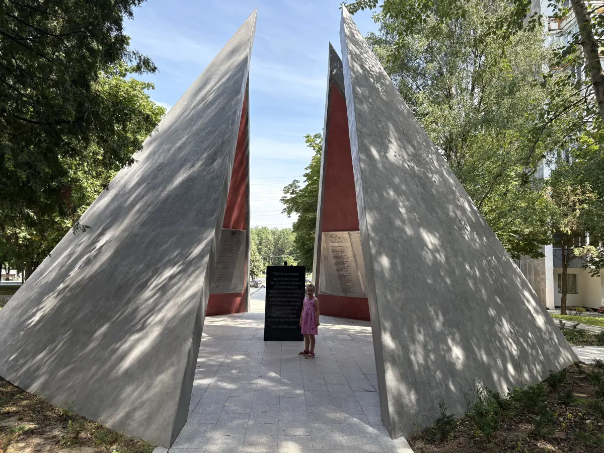 Первая остановка в этой прогулке знакомит участника с героической историей Митина, а именно с Мемориалом павшим защитникам Москвы. Здесь, в тиши сквера, на удалении от Пятницкого шоссе стоит скромный обелиск — четыре наклонённых к центру щита, испещрённые внутри списками погибших защитников. Внутри хочется постоять, подумать о подвиге митинцев, положивших свои жизни, защищая подступы к Москве (линия фронта проходила всего в 15 километрах от этих мест). Ещё дальше в глубине сквера находится и братская могила с часовней. Рядом с обелиском расположены противотанковое орудие времен Великой Отечественной войны и ракета ПВО более позднего времени, а также место для возложения цветов.