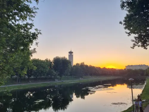 - Перейдём по подземному переходу Марксистскую улицу и свернём в Тихий тупик. Он действительно тихий, потому что дальше начинается Таганский парк. Это одно из моих любимых мест в нашем районе. Здесь растут высокие деревья, благодаря которым нежарко в любую погоду, и красивые цветы, которые хочется рассматривать и нюхать, а также фонтан, который, как мне кажется, похож на торт. Ещё тут есть стадион. Зимой здесь заливают каток, и папа меня учит кататься на коньках. А летом на стадионе проходит много тренировок, и я люблю наблюдать за спортсменами. Вообще побегать по дорожкам может каждый, так что приходите в кроссовках, а зимой берите с собой коньки (или возьмите их напрокат).