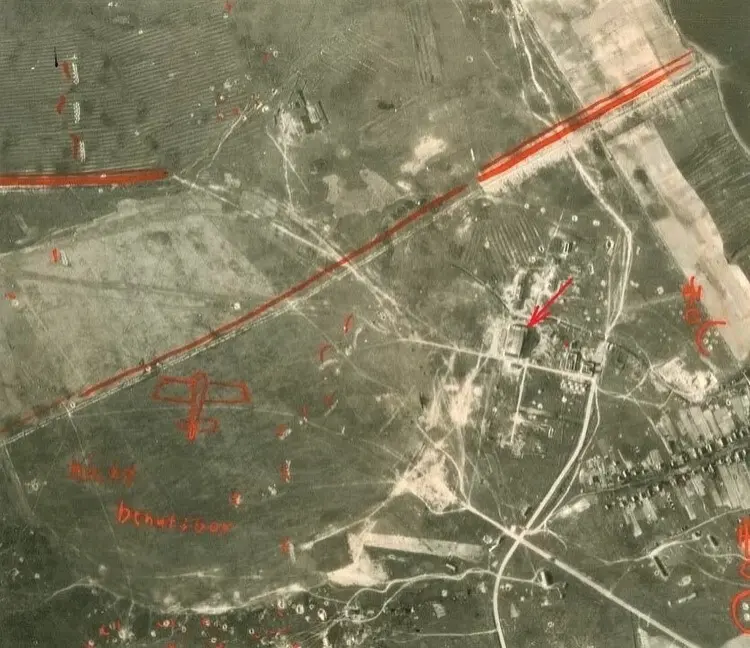 Снимок 1941-42 годов: красная стрелка указывает на ангар, слева от него чётко видны очертания лётного поля. В правом нижнем углу видны дома деревни Захарково, на этом месте сейчас проходит южная часть Химкинского бульвара, доходящая до водохранилища (на фото оно справа).