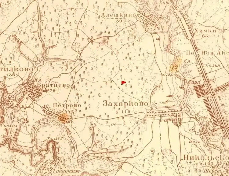 Если посмотреть на фрагмент карты составленной в 20-х годах прошлого века, хорошо видно, что Алёшкинский лес в те годы доходил практически до нынешней улицы Свободы, а к северу тянулся почти до Куркинского шоссе. Справа от Захарково обозначено русло реки Химки, её ширина составляла около 5-15 м. Красный флажок поставлен в точке, где мы сейчас находимся.