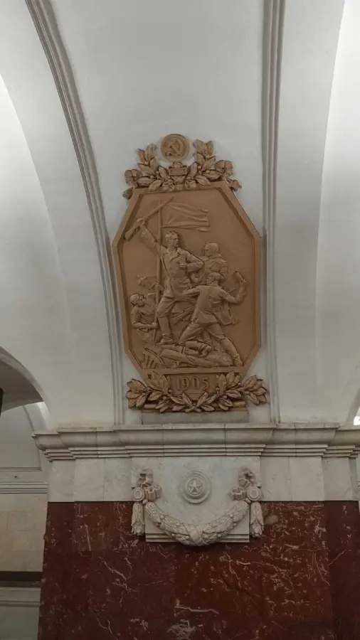 4. Барельефы: не хочу, чтобы вы верили сведениям из интернета, что прекрасные барельефы на сводах, которые несут основную информационную нагрузку, были размещены на станции в 70-х годах 20-го века. Это неправда! Барельефы были там изначально, просто были они белого цвета, а затем во время реставрации 1975-77 годов их выкрасили в золотой. Всего 14 гипсовых барельефов. Пять из них посвящены революции 1917 года и девять — революции 1905 года.