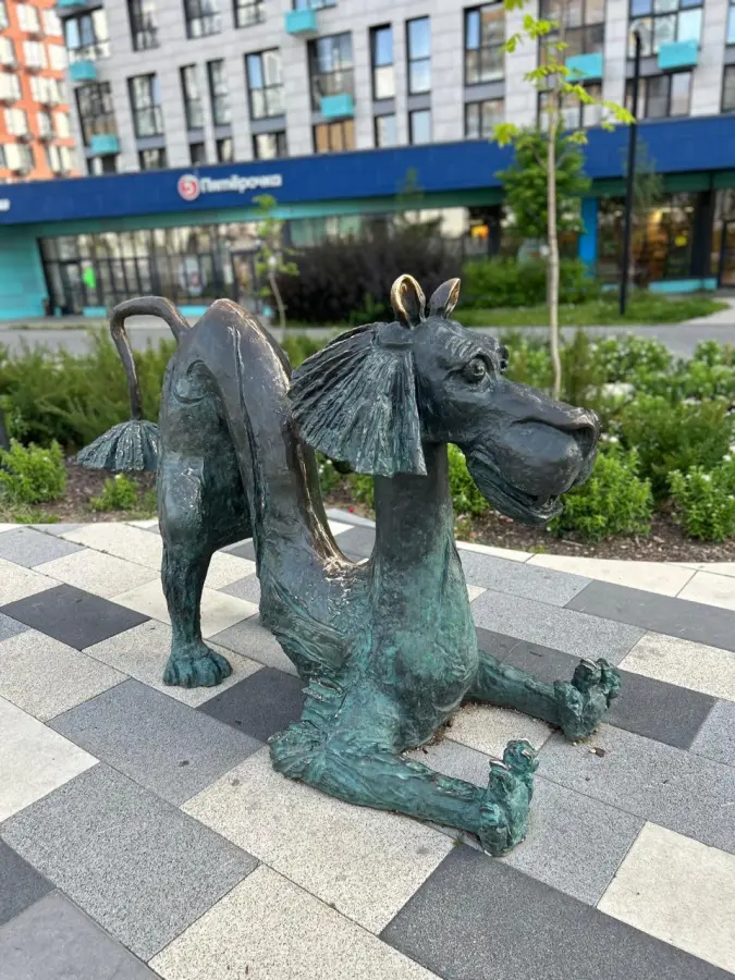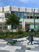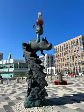 Вернемся на другую часть площади, перейдем через широкий пешеходный переход в сторону сухого фонтана с подсветкой. Летом здесь можно весело искупаться вместе с местными детьми, а можно пройти немного подальше, посидеть на улыбающемся крокодильчике и поздороваться за руку с Крошкой Мю, которая выгуливает там своего питомца каждый день.