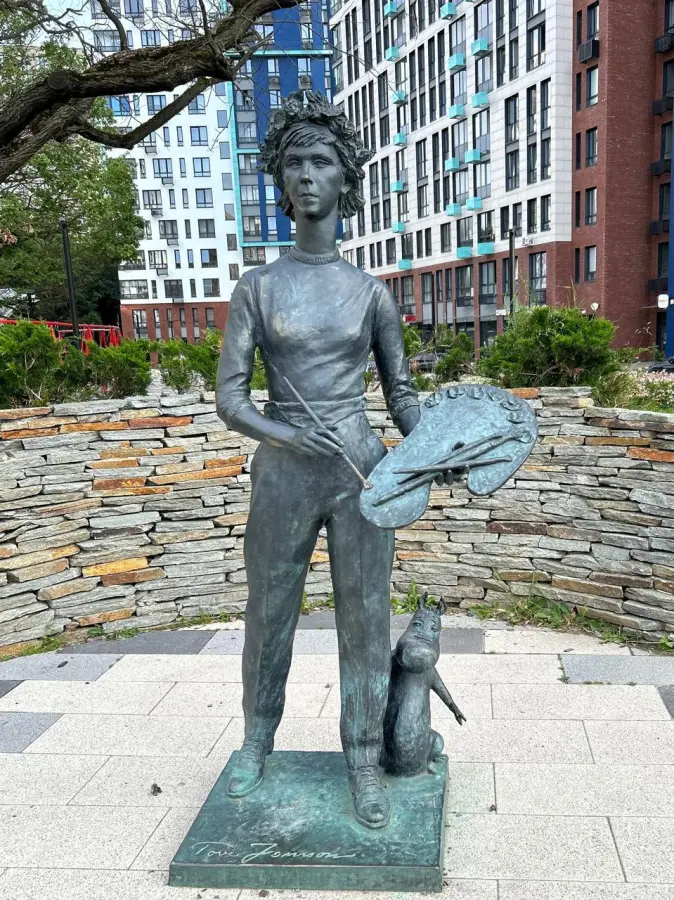 Посмотрите, какая Туве Янссон маленькая и хрупкая, а ведь скульптура сделана в её полный рост. На голове у сказочницы простой и красивый венок из цветов, такой же, как на её сохранившихся личных фотографиях. В её руках — палитра с красками и кисти, ведь она была ещё и художницей, и создала иллюстрации к своим сказкам. Внизу, у ног Туве Янссон стеснительно прячется малыш Муми-тролль.