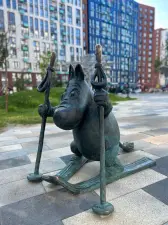Теперь попробуйте догнать Муми-тролля, который уезжает с площади на лыжах по направлению к Бутовскому лесу. Может быть, эта скульптура вдохновит и вас на занятия спортом. Только посмотрите, как блестят, словно золотые, верхушки лыжных палок, все хотят за них подержаться, может быть, чтобы зарядиться сказочной энергией и поймать удачу?
