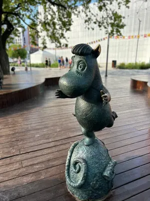 Совсем рядом с Туве Марикой Янссон вы увидите самую большую скульптуру на площади — Муми-тролль, спускающийся вниз по лестнице с керосиновой лампой в лапке, ночью эта лампа-фонарь светится! Приглядитесь повнимательнее к этой огромной лестнице и найдите на ней ещё кое-что интересное.