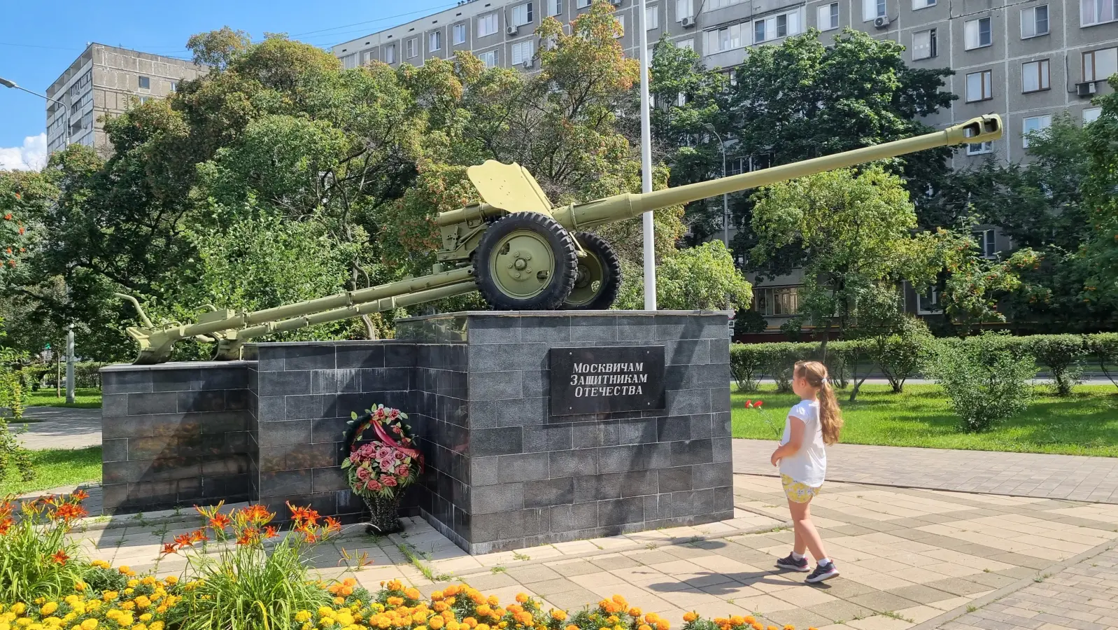 Далее мы отправляемся к памятному знаку – артиллерийскому орудию «Москвичам – защитникам Отечества», который находится в сквере на улице Ташкентская между домами 28 и 29. В годы Великой Отечественной войны район Выхино принимал участие в противовоздушной обороне Москвы. 745-й зенитно-артиллерийский полк, затем 55-я зенитно-артиллерийская дивизия защищали юго-восток Москвы и Московской области от налетов немецко-фашистской авиации.