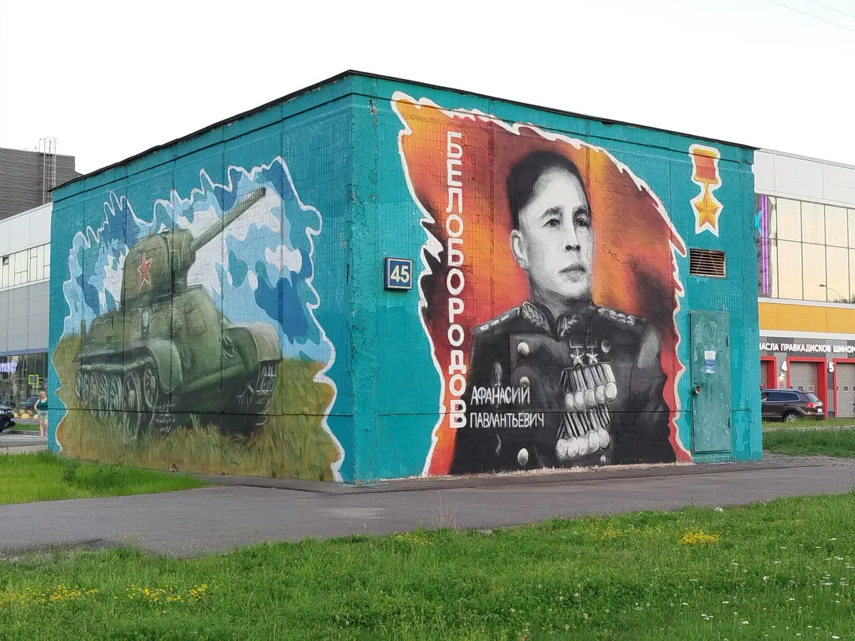 Неподалеку от меня находится улица Генерала Белобородова, названная в честь генерала Белобородова Афанасия Павлантьевича, командовавшего 9-ой гвардейской дивизией. Во время Великой Отечественной войны его дивизия держала оборону на Волоколамском шоссе. Мурал, посвященный генералу, можно увидеть на отдельно стоящем здании по адресу улица Дубравная, дом 45 (фото 1).