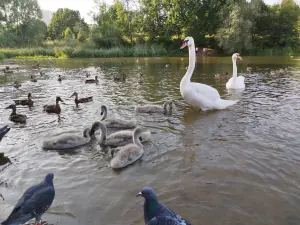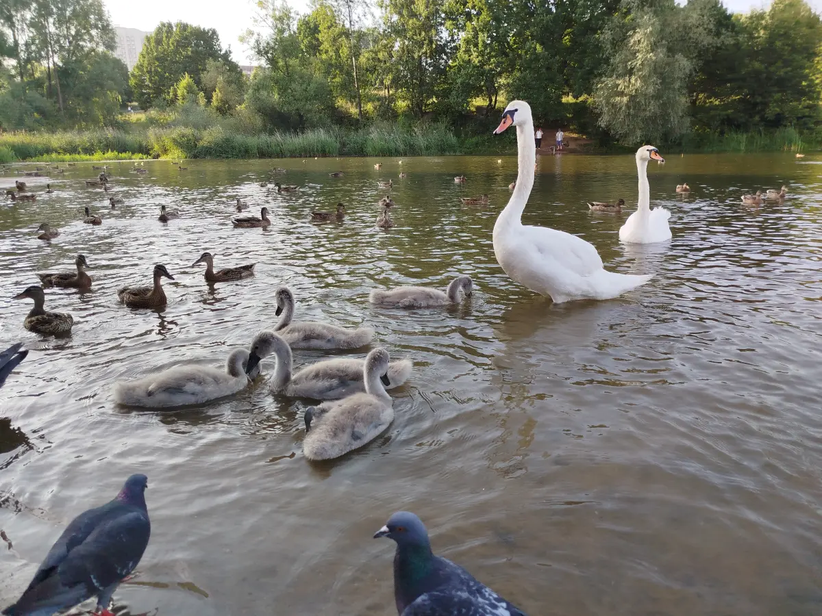Если спуститься вниз с холма, то можно попасть к Пенягинскому пруду. На нем оборудована зона отдыха с лежаками. Здесь можно потупить, наслаждаясь прекрасными видами и погодой. А также покормить птиц, которых всегда здесь в избытке. На пруду обитает множество лебедей и уток (фото 8). В этом году я впервые увидел маленьких лебедят, которые совсем не похожи на гадких утят! Птицы с удовольствием едят корм, который можно взять в автомате, яблоки, морковь и траву. Но надо быть готовым к тому, что на пиршество в больших количествах пожалуют голуби, воробьи, вороны, дрозды и чайки, обитающие неподалеку.