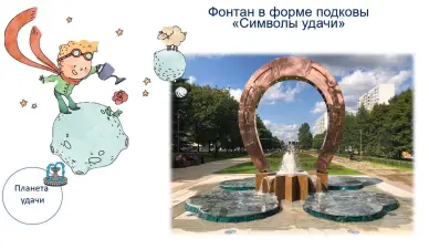 5. Пятая планета — планета «Удачи» очень занятная. Она оказалась меньше всех. На ней расположен фонтан, композиция которого выполнена в виде символов удачи — подкова и четырёхлистный клевер (основание фонтана). Это настоящая магия под ногами! Фонтан скрывает все свои механизмы под землей. Мы видим только форсунки, из которых вырываются струи, словно живые фонтаны, бьющие из-под земли. Это настоящая иллюзия, которая завораживает и удивляет!