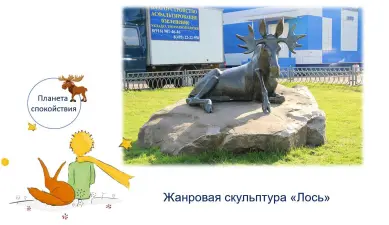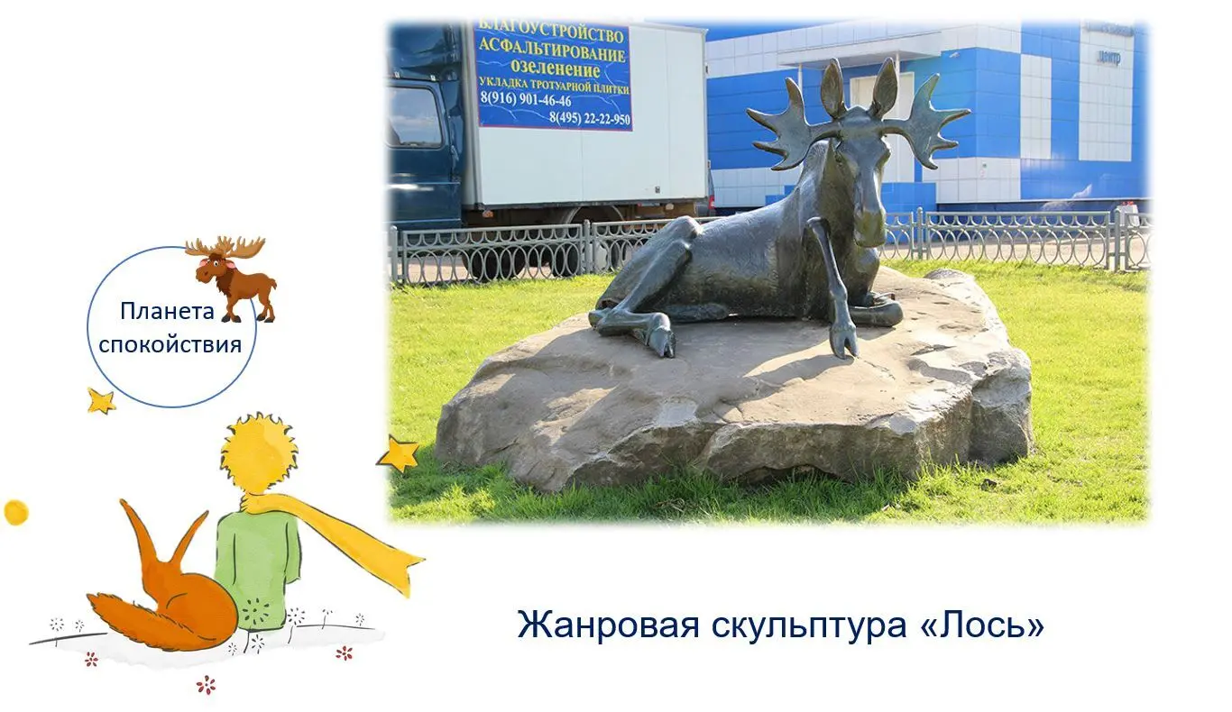 2. А я отправляюсь дальше на планету «Спокойствия» — скульптура Лося на Крылатских холмах. История появления Лося имеет много тайн и загадок, так как до наших дней не дошло ни одного официального документа, как эта скульптура появилась. Считается, что данный монумент появился в середине 80-х годов прошлого столетия и изначально выглядел иначе: рядом с лосем располагалась бронзовая скульптура мальчика, в руках которого был шар. Куда же он исчез? Может быть, он отправился искать свою розу? А может быть, мальчик приручил лося, и они стали друг для друга единственными в целом свете… Всё это загадочно и непостижимо. И если к вам подойдет бронзовый мальчик с шаром, вы уж, конечно, догадаетесь, кто он такой. Тогда скорей напишите мне, что он вернулся…