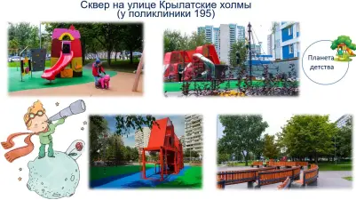 3. А что это там такое яркое вдалеке? Скорее на планету «Детства». Этот сквер — настоящий рай для детей, да и взрослых. Ведь все взрослые сначала были детьми, только мало кто из них об этом помнит. Уж такой народ эти взрослые. Я сейчас объясню. Здесь есть целых две современных детских площадки: качели, большой игровой комплекс с лесенками, горка, песочница. Для детей постарше установлен красный игровой комплекс. А ещё там есть необычные качели-балансир и «паутинка» из веревок. Рядом между площадками находится сцена и специальные деревянные сиденья для праздников.