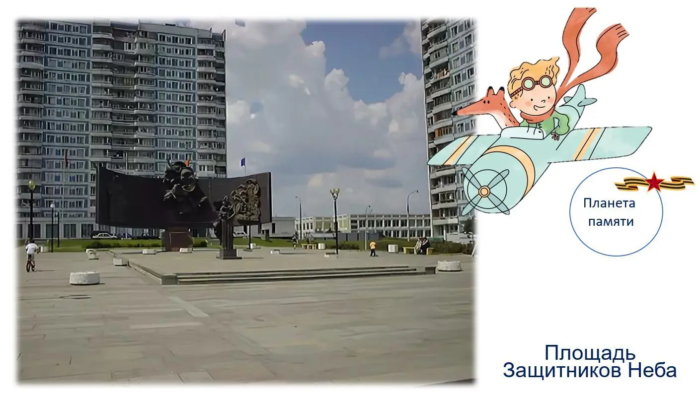 4. Если идти всё прямо да прямо, далеко не уйдёшь, поэтому мы сворачиваем на планету «Памяти» — на Площадь Защитников Неба. По легенде, на этом месте советские военные сбили первый немецкий самолет, который в 1941 году пытался прорваться к Москве. Главным элементом площади является памятник «Героям противовоздушной обороны Москвы в Великой Отечественной войне 1941-1945 гг». Памятник состоит из нескольких композиций. На переднем плане находится скульптура Матери-Родины с младенцем на руках. За её спиной громоздится изогнутый экран с медно-бронзовыми барельефами. На одном изображен воздушный бой, на втором — зенитная батарея, а на третьем — несущие заградительный аэростат солдаты. На обратной стороне экрана выгравированы названия военных частей, которые обороняли Москву. Небо было и для Антуана де Сент-Экзюпери любовью на всю жизнь.