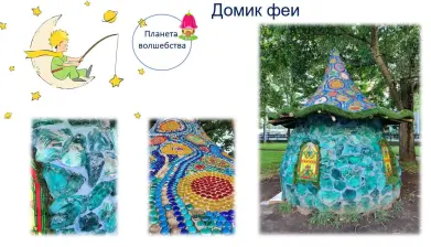 6. А что же там так сверкает? Это следующая планета — планета «Волшебства». На ней нет ничего, кроме красивого мерцающего домика. Кто в нём живет? Возможно, это домик гнома? Эльфов или домового? Для чего нужен этот дом? На самом деле это насосная, где находится оборудование для фонтана. Насосная оформлена в виде «Домика феи», декорирована стеклянным камнем эрклезом, а крыша выложена разными узорами из марблс, ракушек, страз. Представьте себе: мы идём по улице, и вдруг из-под ваших ног начинают бить струи воды, создавая ощущение волшебства и прохлады в жаркий день! Это возможно благодаря работе насосной. Прекрасное занятие. Это по-настоящему полезно, потому что красиво!