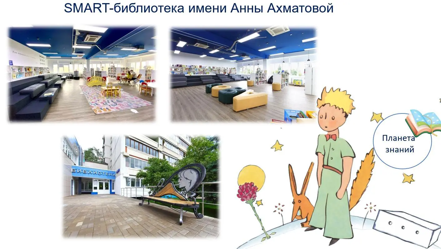 1. Мы с вами отправляемся на первую планету — «Знаний». Библиотека № 197 имени А.А. Ахматовой — не просто библиотека, а технологичное пространство, в котором созданы все условия для проведения досуга и чтения. Театр начинается с вешалки, а смарт-библиотека со скамейки. Сразу при входе в библиотеку установлена скамья с абрисом Анны Ахматовой. Внутри пространство библиотеки поделено на насколько зон: коворкинг с бесплатным доступом к интернету; кинозал, типография; арт-пространство для выставок; кафе и даже студия звукозаписи. В библиотеке будет интересно не только моему лучшему другу, взрослому, хотя он понимает все на свете, даже детские книжки, но и малышам. Здесь есть детская игровая зона и центр раннего развития для малышей.