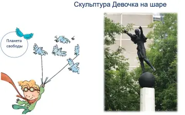 7. Последняя планета, которую мы посетим — планета «Свободы» — скульптура «Девочка на шаре». В 1987 году в Москву приезжала Премьер-министр Англии Маргарет Тетчер. Один из пунктов обширной программы пребывания Тетчер предусматривал посещение образцового микрорайона Москвы. Руководство страны хотело поразить заграничного лидера. Решили как-то по-особенному вдохнуть жизнь во внешний облик современного района. Так скульптура и появилась. Скульптура представляет собой бронзовую фигуру девушки спортивной формы. Одной ногой она стоит на шаре. Её руки направлены вверх, словно она готовится к полету. Голуби, образующие за спиной спортсменки подобие крыльев, как бы вылетают из её подмышек. Она хочет улететь, прямо как я с перелетными птицами.