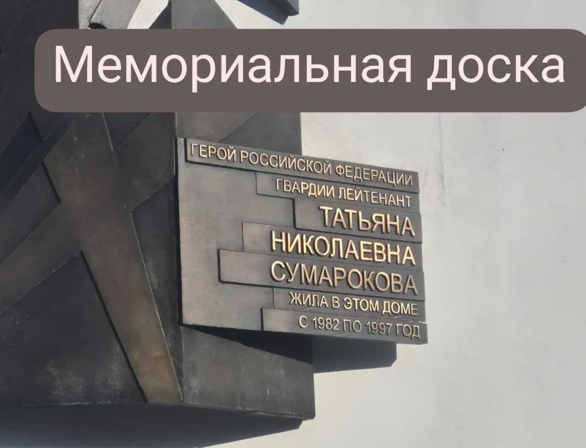 Мы переходим улицу Миклухо-Маклая, названную так в честь русского путешественника и подходим к дому № 22, где жила герой России Т.Н. Сумарокова. На мемориальной доске видим образы ночного военного неба и самолёта У-2 в перекрестье лучей прожекторов, что отражает военную специальность героя.