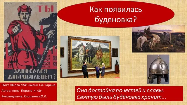 Рассматриваем шлемы богатырей на картине В. Васнецова «Богатыри» и рассказываем о роли художников В. Васнецова и Б. Кустодиева в разработке военной формы для Красной армии. Показываем фото с музейными экспонатами шлемов, а потом показываем несколько плакатов и фото с изображением красноармейцев времен Гражданской войны. Показываем фильм про Мальчиша-Кибальчиша и тоже обращаем внимание на его головной убор.