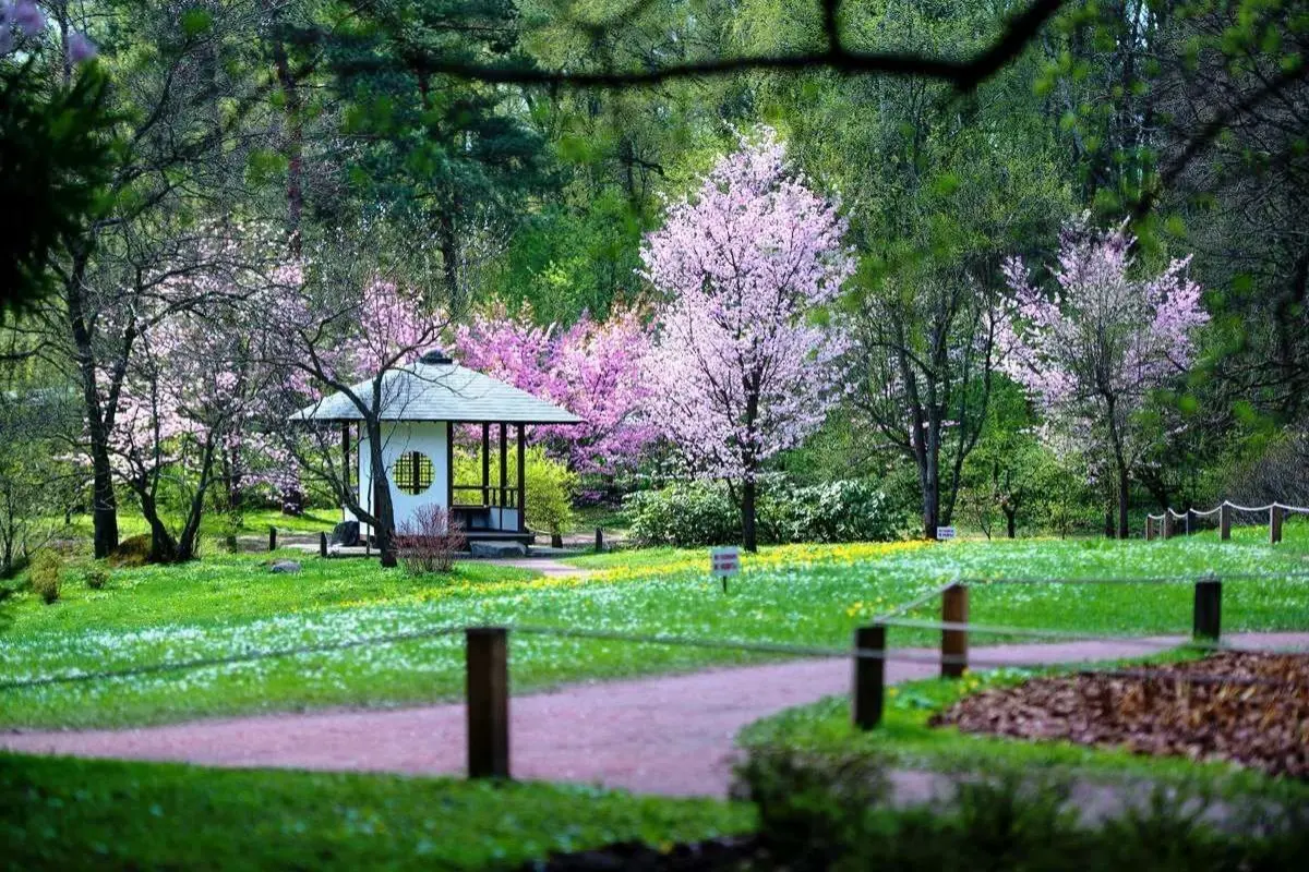 Отправная точка нашего маршрута – Японский сад в Главном ботаническом саду имени Н. В. Цицина. Этот сад построили много лет назад, в 1980-х годах, по идее японского архитектора Кена Накадзимы. Сад получился очень красивый! Здесь есть маленькие водопады, пруды с мостами, красивые павильоны, как будто из японских сказок, и высокая каменная башня – пагода. В Японском саду растет много разных растений, около 70 видов! Некоторые привезли прямо с японского острова Хоккайдо. Весной, когда тепло, тут расцветает сакура – очень красивые розовые деревья.