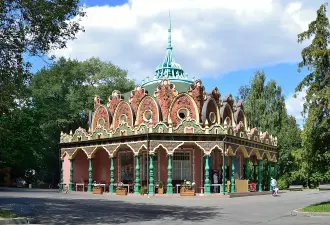 А теперь, если мы посмотрим не на воду, а в сторону деревьев, то увидим очень красивое здание, как будто яркая шкатулка. Это павильон «Главтабак». Он очень необычный и интересный! Здание украшено и восточными узорами, и высокими окошками, как в готических замках, и ещё русскими мотивами, как в сказочных дворцах. Павильон «Главтабак» был построен по проекту художника В.С. Кондратьева и открыт в 1954 году.