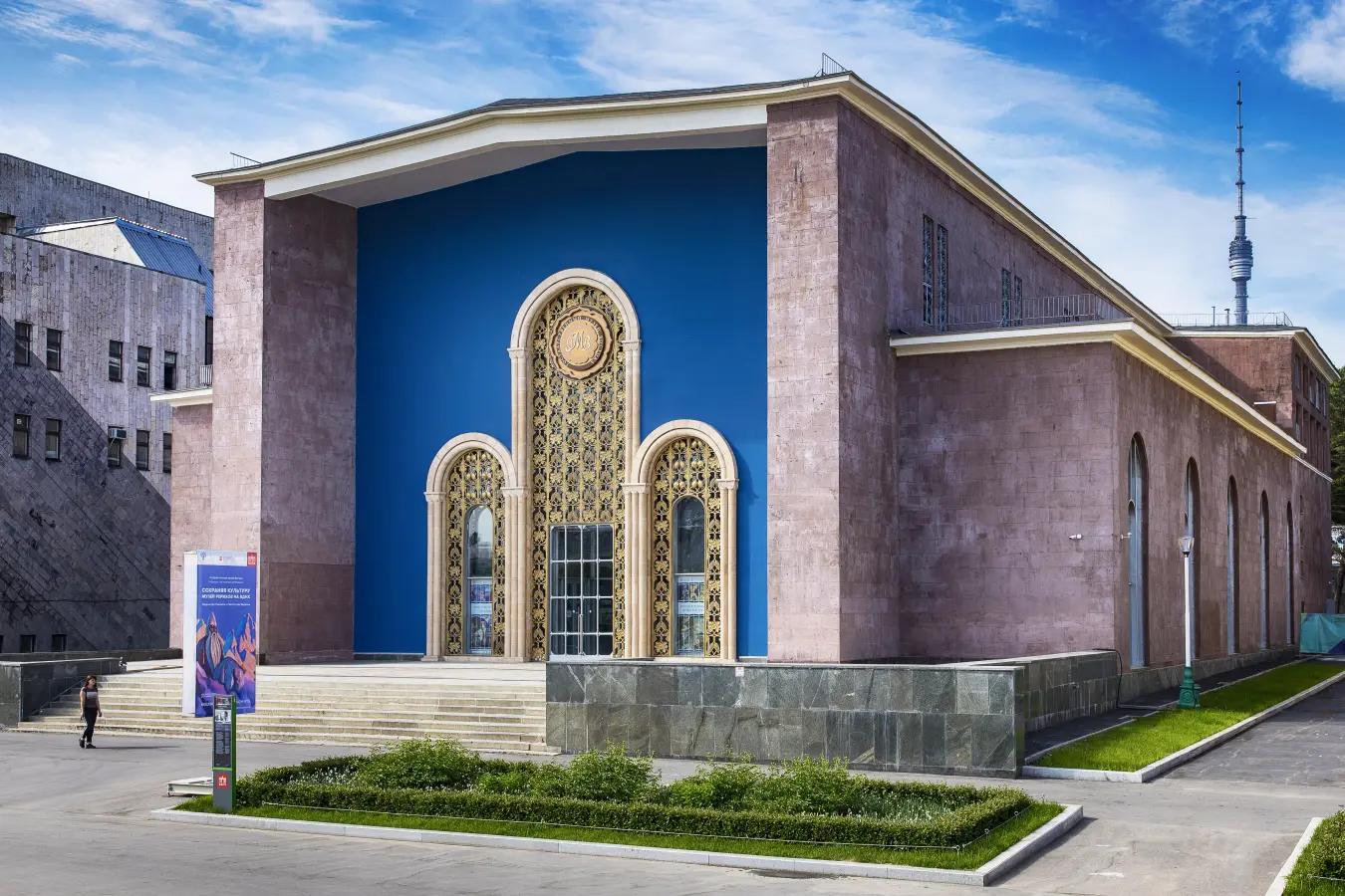 А теперь отправимся в Музей Востока. Этот павильон построили в 1939 году, и он один из немногих, который сохранился с довоенной выставки. Сначала в нём была выставка Армянской ССР, поэтому здание украшено армянскими узорами. Главный вход выглядит очень красиво: он как бы разделен на три части и украшен синим цветом и орнаментами с растениями. В музее можно увидеть больше 1500 разных интересных вещей со всего Востока. Тут есть предметы искусства с Кавказа, из Средней Азии, с Дальнего Востока, из Юго-Восточной Азии, с Ближнего и Среднего Востока, из Центральной Азии и даже из Африки. А ещё здесь можно посмотреть на работы семьи Рерихов и разные временные выставки. Очень интересно!
