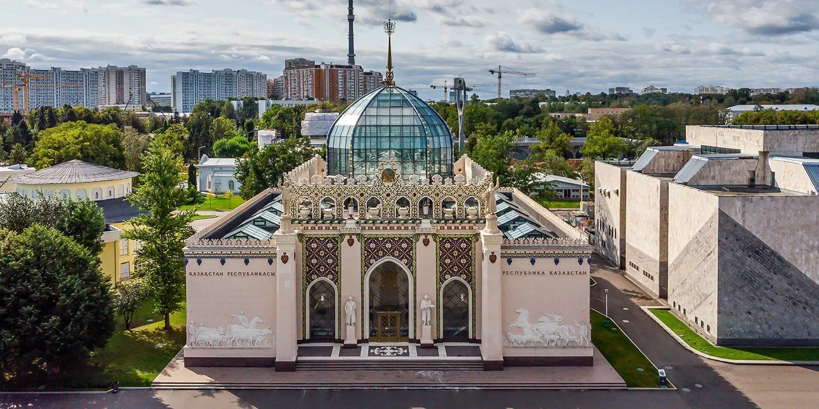 Этот павильон, посвященный Казахстану, был построен в 1937 году и менял свой облик несколько раз. Главный фасад – это трёхпролётная арка, украшенная скульптурами, барельефами и колоннами. В отделке использованы майолика и бронза, а венчает здание прозрачный купол со шпилем. Сейчас здесь находится Выставочно-торговый центр Республики Казахстан. В рамках ознакомительных экскурсий сотрудники павильона рассказывают о национальных традициях и истории страны. Здесь можно увидеть масштабные экспозиционные макеты «Шелковый путь», «Нур-Султан», «Стратегия развития», а также другие уникальные экспонаты казахской культуры и узнать о достижениях страны.