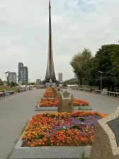 В конце аллеи виден монумент с ракетой. Правильно его называют монумент «Покорителям космоса». Этот монумент появился в память достижений советского народа в освоении космического пространства. Его высота составляет 107 метров. Кстати, его видно из окон моего дома.