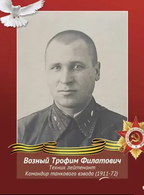 Мой прадед мечтал о победе, о том, как его взвод ворвется с боем в Берлин, как вернётся он с Победой домой, но не всем его мечтам суждено было сбыться. В период Брянской наступательной операции в сентябре 1943 года 233 отп освобождал от противника Рогнединский район. Шли затяжные бои. Враг рвался вперёд. Бой за деревню Копаль стал для Трофима Филатовича последним. Фашисты яростно сопротивлялись. Рвались снаряды, от взрывов дрожала земля, скрежетали гусеницами танки, плавился металл. Одна за другой останавливались боевые машины, в которых заканчивался бензин. Командир танкового взвода техник-лейтенант Возный «всегда лично сам производил заправки боевых машин, непосредственно во время боя», написано в наградном листе. Так было и в этот день. В танк Т-34, который заправлял мой прадед, попал снаряд. Машина загорелась, а Трофиму Филатовичу осколком оторвало левую ногу. Вынес его с поля боя тяжело раненный лейтенант Сергей Матвеев — командир подбитого танка.