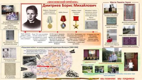Накануне Дня Победы я был со своей семьёй на экскурсии в нашем школьном музейном комплексе «Диалог поколений». Среди представленных экспонатов экспозиций я обратил внимание на черно-белое фото – с фотографии на меня смотрел красивый молодой человек лет шестнадцати. Экспозиция была посвящена Герою Советского Союза Борису Михайловичу Дмитриеву, молодому партизану, который, как оказалось, мой земляк. Много интересных фактов из жизни и о подвиге героя узнали мы во время экскурсии. Но моей семье также захотелось найти и познакомиться с его родственниками. Мы нашли племянников Героя и встретились с ними. Они нам рассказали, что мама Бориса Дмитриева, когда была ещё жива, очень хотела, чтобы в Москве, где жил её сын до войны, была увековечена память о нём в топонимике города. Поэтому наша семья решила написать ходатайство в администрацию района об увековечивании памяти Героя в нашем районе и присвоении безымянному скверу на улице Полковой имени Героя Бориса Дмитриева.