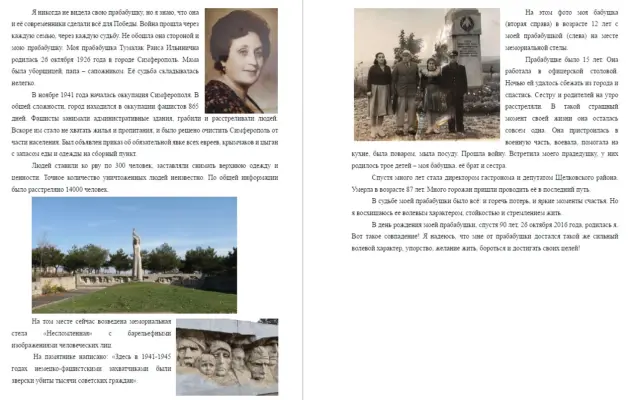 ![]()Я никогда не видела свою прабабушку, но я знаю, что она и её современники сделали всё для Победы. Война прошла через каждую семью, через каждую судьбу. Не обошла она стороной и мою прабабушку. Моя прабабушка Тумалак Раиса Ильинична родилась 26 октября 1926 года в городе Симферополь. Мама была уборщицей, папа – сапожником. Её судьба складывалась нелегко.
