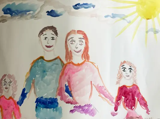 Это моя семья, мама, папа, я и сестренка! Мы очень счастливы на этом рисунке, потому что светит солнце, и голубое небо с пушистыми облаками! Я люблю лето!