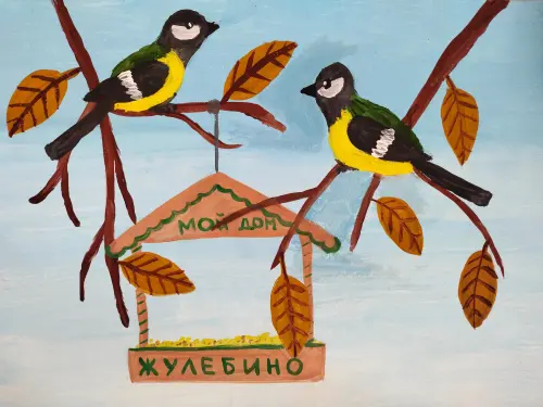 Когда наступила поздняя осень и стало совсем холодно и неуютно, ребята смастерили для птиц кормушку и повесили у себя во дворе. Теперь с утра двор наполнен радостным щебетанием.