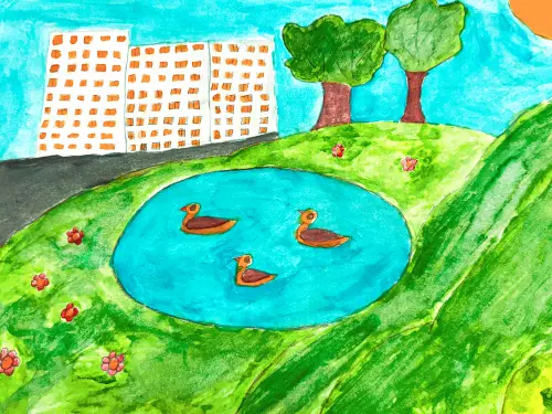 Я нарисовала наш пруд в Зюзино. Он очень старинный и важный для района. Пруд красивый — вокруг деревья, цветы. В нём живёт семья уток: мама, папа и пятеро утят. Я люблю приходить туда смотреть, как они плавают и играют. Хочу, чтобы пруд всегда оставался чистым и живым!