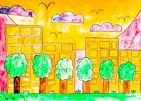 На своей работе я изобразила свой район, жилые дома, я очень люблю место, где я живу, и поэтому выбрала такие яркие цвета! Наш район Вороново очень зелёный и красивый, свежий воздух и живая природа!