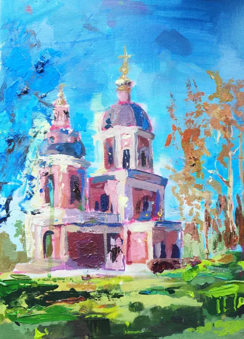 Пленэрный этюд Храма выполнен с натуры. Холст на картоне, акрил, мастихин.