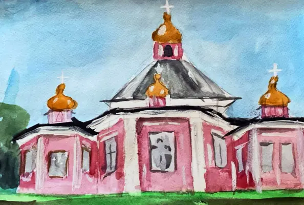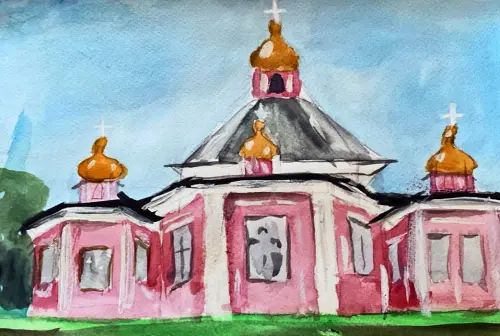 Моя работа написана акварелью. Моим любимым материалом. Церковь я писала с натуры. Меня привлекла такая яркая, красивая архитектура. Я хотела передать настроение лета и радости.