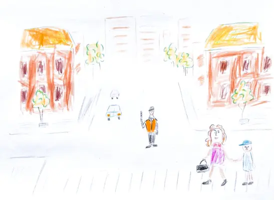 Жанр: городской пейзаж. Техника: цветные карандаши. Я очень люблю наш город и часто гуляю с семьёй по его улицам. Особенно впечатляет, как быстро он развивается: появляются новые районы, места отдыха, и мои любимые детские площадки, на которых по вечерам я провожу время. Но вместе с тем, затрудняется дорожное движение. На рисунке изображены новые районы города Зеленоград на Георгиевском проспекте и его жители. Мама заботливо ведёт в детский сад своего малыша, также как и моя мама ведёт меня за ручку. Когда идём в детский сад мы всегда рассматриваем окружающую нас природу: деревья и их листву, животных и насекомых, а однажды мы даже встретили ёжика. Трудно себе представить, как будет выглядеть город через 5-10 лет. Но я уверена, что родной Зеленоград останется моим любимым районом и одним из самых уютных в Москве, а его жители будут по-прежнему гордиться городом и счастливы, что живут именно в Зеленограде.