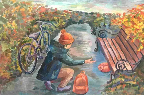 Анастасия обучается в Детской школе искусств им. И.Ф.Стравинского в Митино. "Новый друг в ландшафтном парке Митино" - это картина о том, как мальчик, катаясь на велосипеде в парке "Митино", встретил бездомную собачку и решил стать ее новым другом.