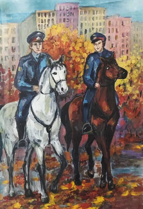 Екатерина обучается в Детской школе искусств им. И.Ф.Стравинского в Митино. На рисунке изображен наряд конной полиции, который следит за порядком в ландшафтном парке района на фоне больших многоэтажных домов.