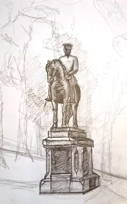 Я ученица 1 курса в художественной школе. В качестве работы для пленэра выбрала памятник Рокоссовскому в нашем районе. Работа выполнена в графике. На формате А4.