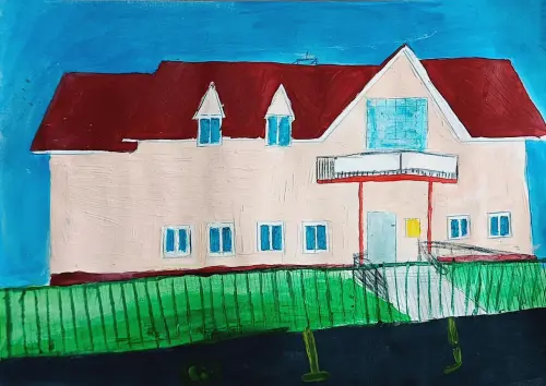 Рисунок "Сохраняя традиции" выполнен в технике работы гуашью. На рисунке изображена Детская школа искусств "Бабенская игрушка" в посёлке Шишкин лес.