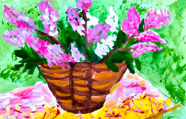 Красивые цветы, аккуратно расположенные в вазе. Большие пышные розы, нежные ландыши, игривые сиреневые ирисы и разноцветные тюльпаны. Цветы имеют насыщенные оттенки — розовые, красные, фиолетовые, жёлтые и белые, создающие яркий и радостный ансамбль. Листья и стебли добавляют рисунку ощущение свежести и живой природы. Общий вид рисунка передаёт атмосферу уюта, красоты и гармонии.