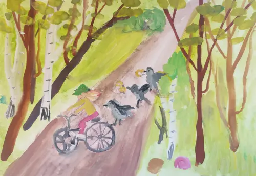 Мне родители подарили велосипед. Он невероятно красивый и быстрый. Мне нравиться кататься на нем в нашем прекрасном парке. Нарисовала, как я еду по дорожке в парке.
