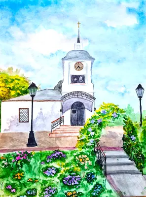 Рисунок выполнен акриловыми красками. С большой радостью и удовольствием прихожу в любимый с детства храм. Во круг храм растет много растений и деревьев за которыми ухаживают.
