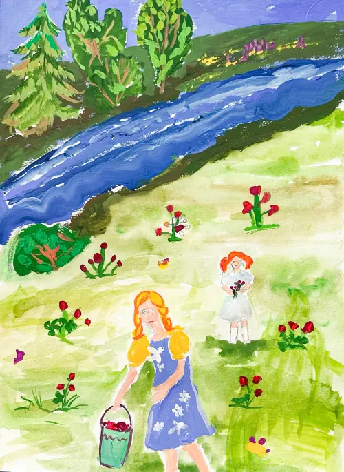 Мы с моей младшей сестрой очень любим собирать землянику в поле возле нашего пруда. Я нарисовала нас, как мы собираем ягоды, а рядом наш пруд, в котором мы тоже любим купаться.