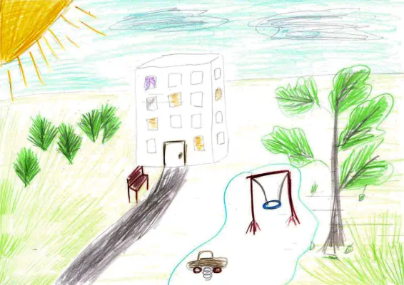 Я нарисовала нашу детскую площадку, где мы гуляем с бабушкой. Мы любим гулять, когда хорошая солнечная погода. Больше всего я люблю качаться на качелях.
