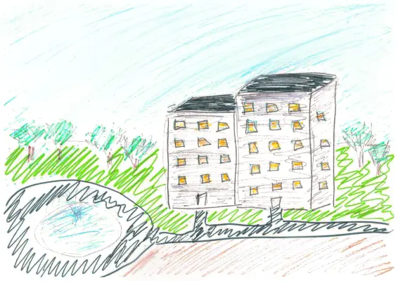 В нашем районе очень много домов. Дом, в котом я живу - самый любимый. В нем много квартир, и там живут наши соседи. Мы дружим с соседями и ходим в гости.