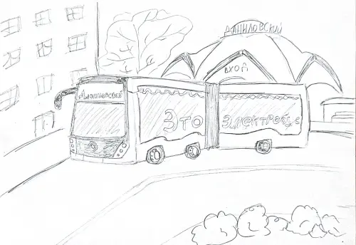 Картина выполнена карандашом. Данной работой я хотел показать любимые места района: Даниловский рынок, где всегда самые вкусные фрукты и красивый дизайн здания; автобус м86, на котором удобно добраться до школы и спортивных секций; а также дом любимой бабушки Зои.